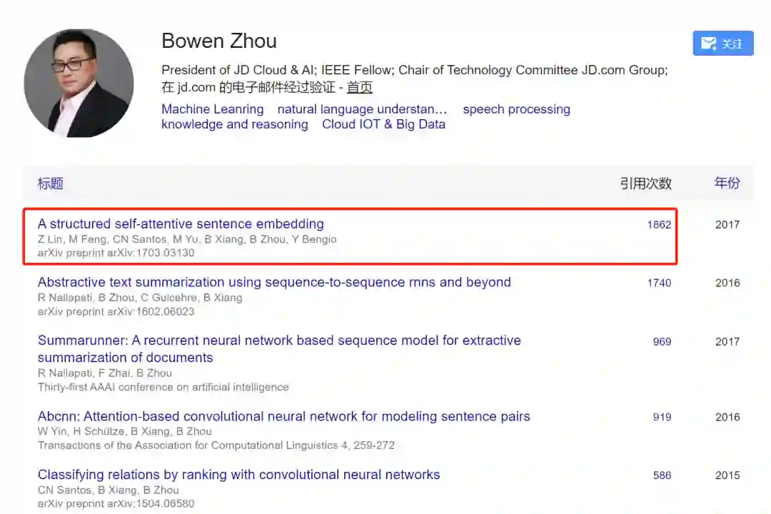 周伯文在中、美等国有数十项专利,其中包括多篇论文被国际学者他引过千,比如首次提出结构性自注意力表征的论文《A Structured Self-Attentive Sentence Embedding》(他与 Bengio 于 2017 年合著)和首个 Sequence-to-sequence 的《Abstractive Text Summarization using Sequence-to-sequence RNNs and Beyond》等工作都被众多国际知名学者引用单篇他引过千,是人工智能研究领域的国际性领军人才。