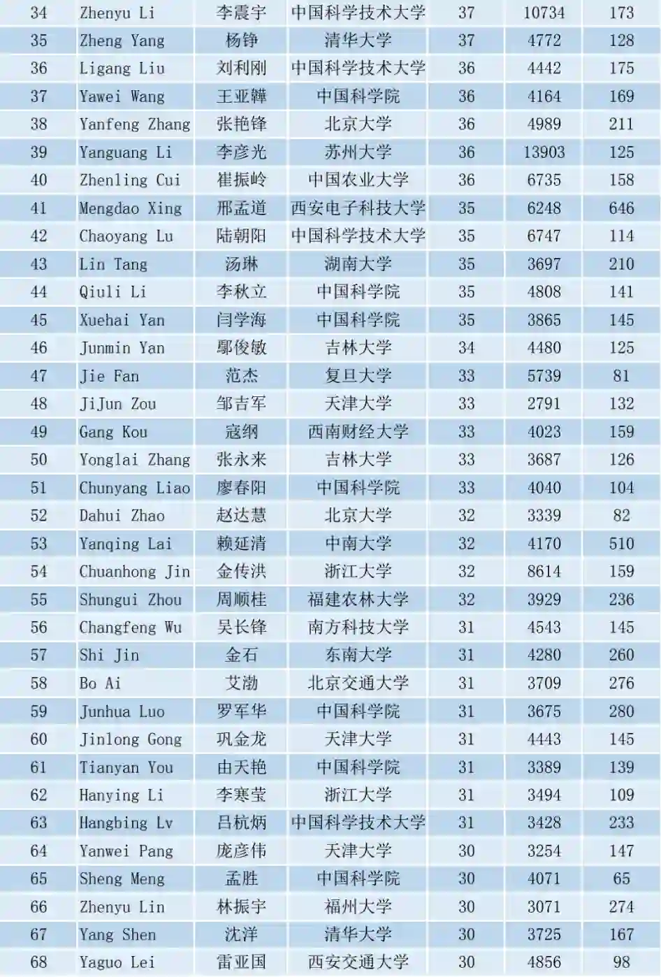 通过对各项数据进行统计分析,可以判别学者之间存在的共同点,查看优秀青年科学基金获得者所属的组织,以及其发表论文情况和影响力,为即将进行的决策提供进一步服务。收录的前 100 名优秀青年科学基金获得者如下(按 h 指数排名):
