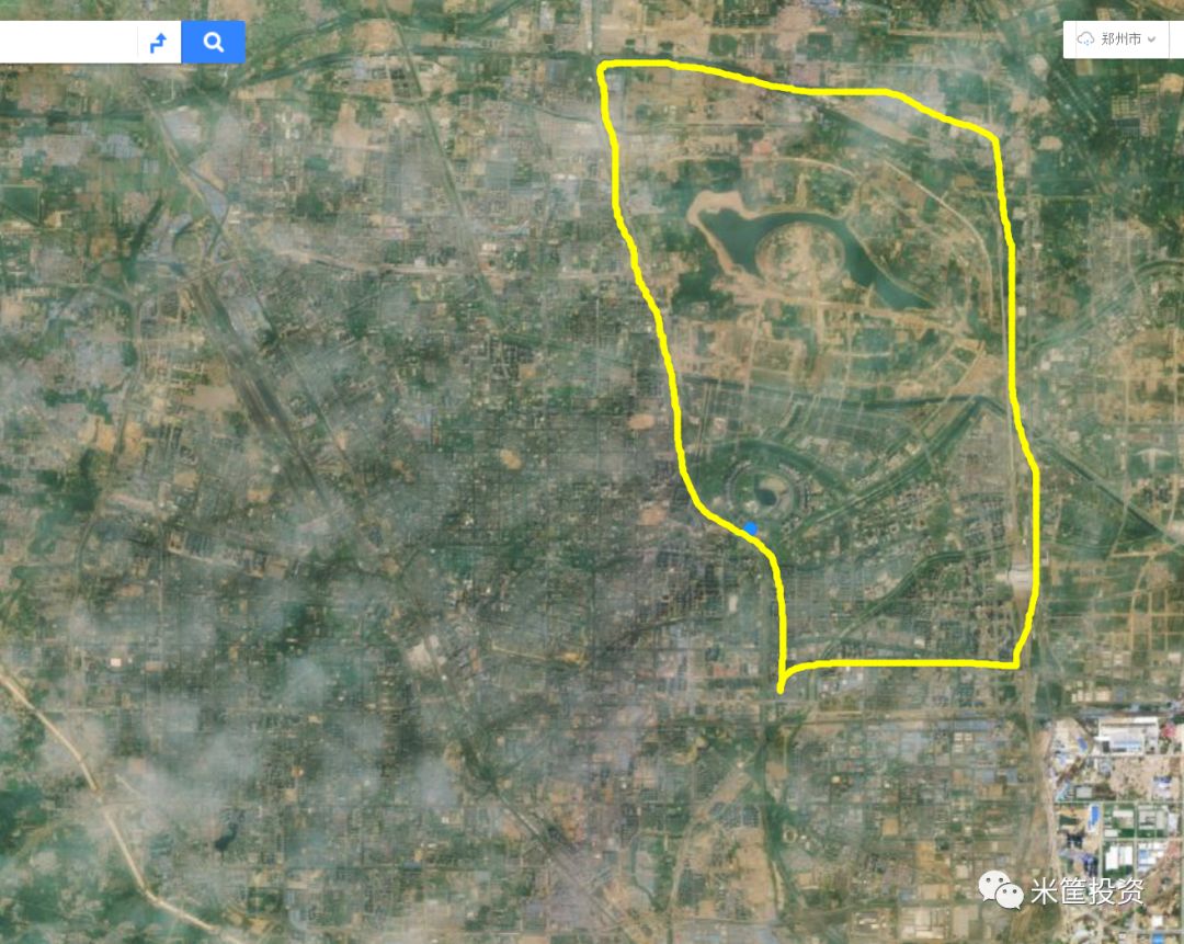 如下图:大刀阔斧所规划的郑州郑东新区(手绘,边界不太工整,未勾画白沙)。