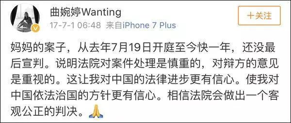 曲婉婷将母亲视为自己的英雄,她曾因发表“妈妈给了我最好的生活,无论她为此付出了怎样的奋斗”遭到网友痛骂。从2016年起,她会不定时出现在社交平台为母亲喊冤。但讽刺的是,她并未出现在2016年7月的庭审现场。自母亲受审后,这位“孝顺”的女儿长居温哥华。