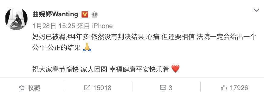 今年是曲婉婷母亲张明杰被羁押后的第四年,按照“惯例”,她会在社交平台为母亲喊冤洗白。就在前天(1月28日),曲婉婷“如约而至”,在微博上说:“妈妈已被羁押4年多,依然没有判决结果,”“但还要相信法院一定会给出一个公平公正的结果。”1月29日,经不起网友狂喷的曲婉婷关闭了微博评论,转战Instagram,称喷她的网友是“无知的血口”。