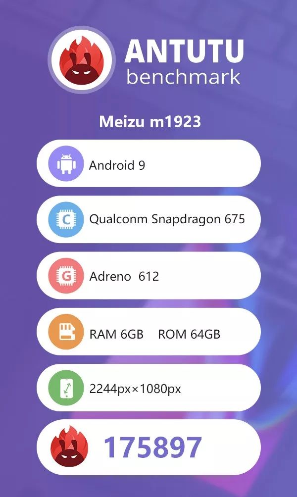 核心配置上,魅族Note 9搭载高通骁龙675移动平台,该平台基于11nm工艺制程打造,首发高通第四代Kryo 460架构(骁龙670、骁龙710和骁龙712采用的是第三代Kryo 360架构),GPU为Adreno 612,安兔兔跑分达到了175897。
