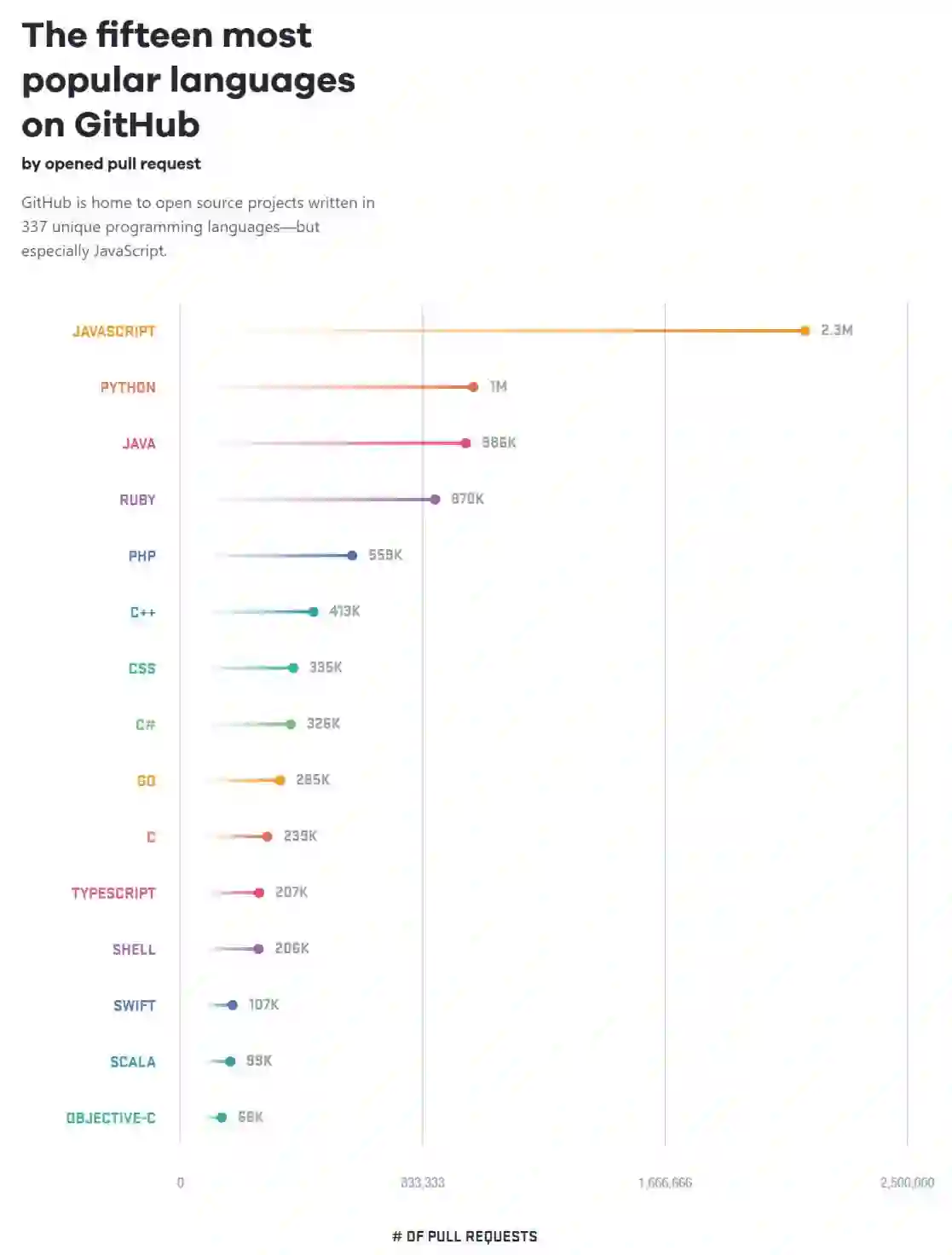 Go 已经被全世界的开发者接受,在世界范围内有大约 1 百万的使用者。在 Github 新近发布的 2017 年 Octoverse 中,Go 在最受欢迎的编程语言中位列第九,超过了 C 语言。Go 还以每年 52% 的增长率成为 GitHub2017 年增长最快的十种语言之一。在增长速度方面,Go 超越了了增长率为 44% 的 Javascript,占据了它的位置。