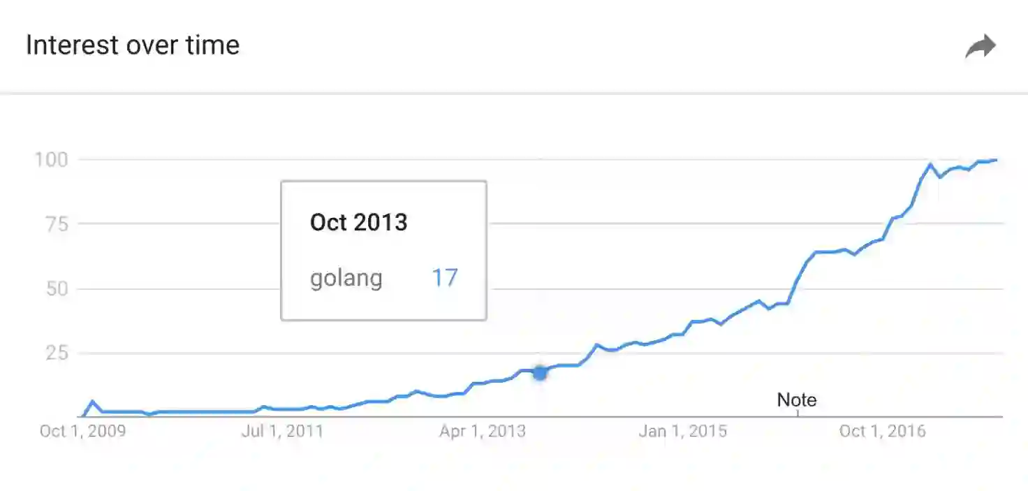 在我们的四年前的博文公告中,我们呈现了一个图表,通过搜索词“golang”来展示 Go 在谷歌趋势中越来越受欢迎的趋势。今天,我们将展示一张更新的图表。在这张流行度相对规模的图表中,四年前被我们设定为 100 的规模与当今相比仅仅为 17。Go 的流行度在过去八年呈指数型增长,并会持续下去。