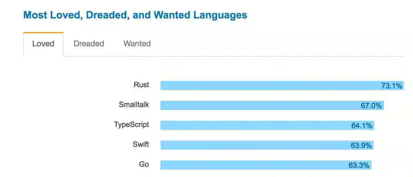 在 Stack Overflow's 2017 年开发者调查中,Go 是唯一一个同时位列“最喜爱的五种语言”和“最想使用的五种语言”的语言。正在使用它的人们热爱它,还没在使用它的人们希望使用它。