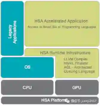 如图所示所见,中间件(即HSA Runtime Infrastructure)在驻留在单个系统中的不同类型的计算设备之间提供了一个抽象层。人们可以将其视为允许在CPU和GPU上运行相同程序的虚拟机。