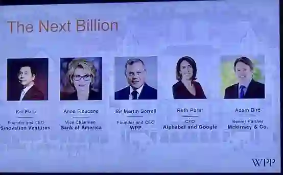 达沃斯当地时间1月25日,在WPP董事长Sir Martin Sorrell亲自主持的 “下十亿用户” 论坛上,创新工场董事长李开复,Alphabet、谷歌首席财务官Ruth Porat,美国银行副董事长Anne Finucane,麦肯锡资深合伙人Adam Bird进行了对谈。