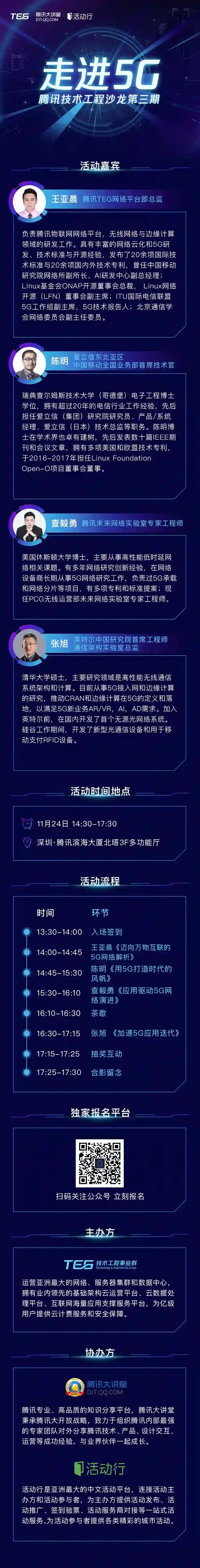 11月24日,“腾讯技术工程——走进5G”技术沙龙将在深圳举行,届时腾讯网络专家、与爱立信、英特尔等重量级行业嘉宾将会结合腾讯在5G技术方面的探索和思考,与参会者共同探讨5G的行业现状、市场趋势、技术解析以及5G对互联网应用和应用架构的影响,精彩不容错过!