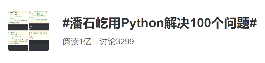 自从在微博上高调宣布要学习Python之后,潘石屹的微博基本上被Python学习的内容独揽了,他还专门建了一个#潘石屹用Python解决100个问题#的tag,目前这个Tag阅读量已经超过了一亿。
