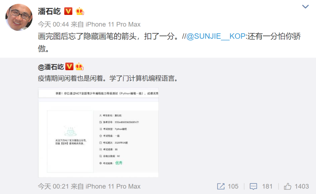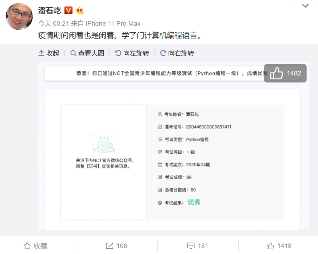半年过去了,今天凌晨,潘石屹在微博晒出了自己的第一张Python考试成绩单,“通过NTC全国青少年编程能力等级测试(Python编程一段)”,还取得了99分的优秀成绩!截止到发稿,这条微博已经得到了1400多赞。