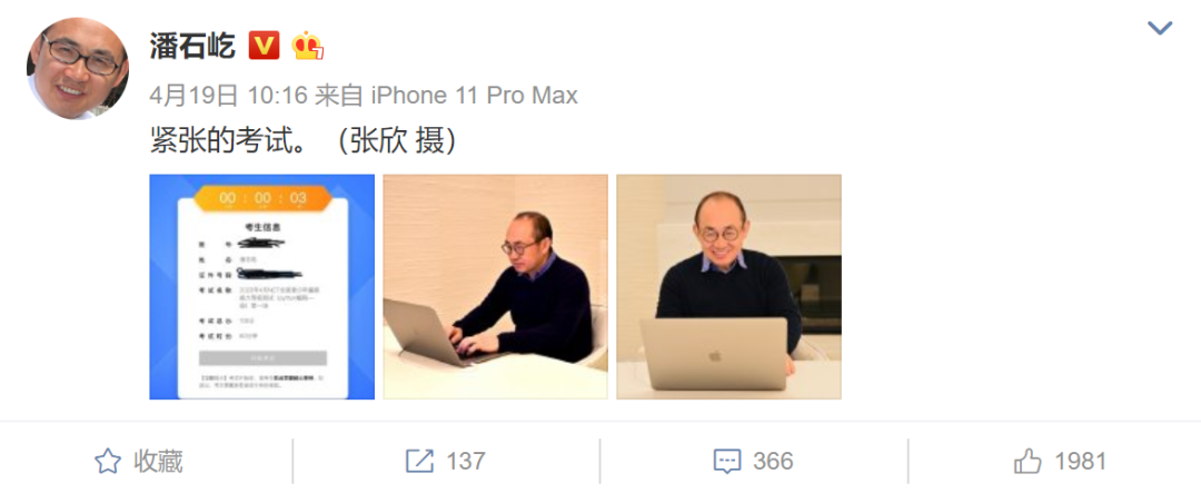 受疫情影响,潘石屹的这场考试是在家中完成的,夫人张欣还为他拍照留念了这张“紧张的考试”。