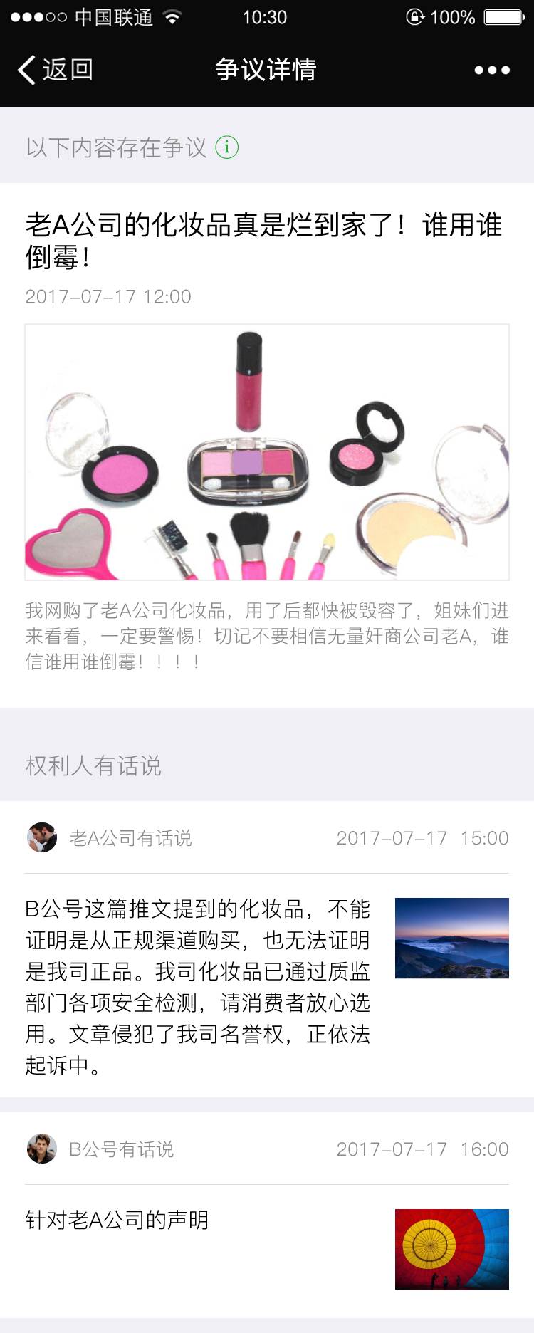 今天,榜妹发现网上流出一张微信公众号文章展示“争议详情”的截图。文章上方标有“以下内容存在争议”,页面下方有一块区域为“权利人有话说”,展示争议双方的声明。