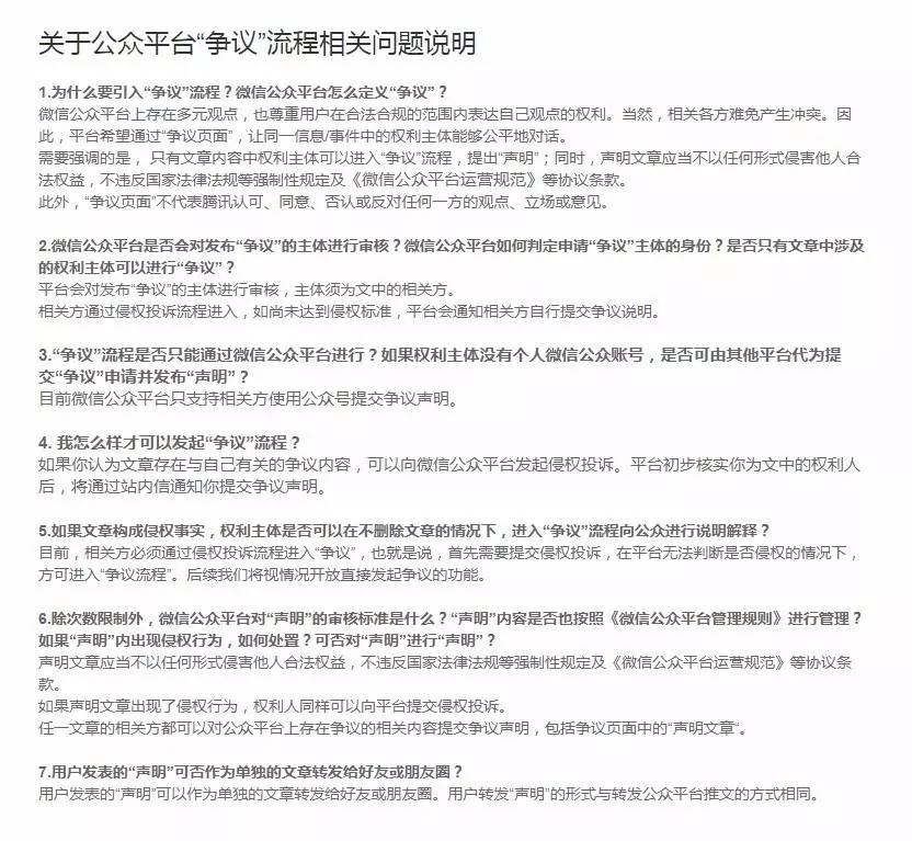 在腾讯客服官网,榜妹也发现了一份《关于公众平台“争议”流程相关问题说明》(如下,点击可查看大图)。据榜妹求证,“争议”功能今晚9点多已正式上线。