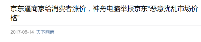 在今年6.18年中大促预热期间,“天下网商”在微信公号上转载微博网友的爆料,发布了题为《京东逼商家给消费者涨价,神舟电脑举报京东“恶意扰乱市场价格”》的文章。
