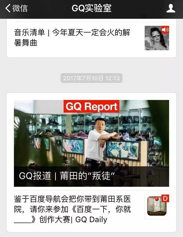 7月10日,GQ中国旗下微信公众号“GQ实验室”发布了名为《鉴于百度导航会把你带到莆田系医院,请你来参加<百度一下,你就——>创作大赛GQ Daily》的文章,在结尾发起了让读者参与填空的话题,并举例“百度一下,你就完了”。