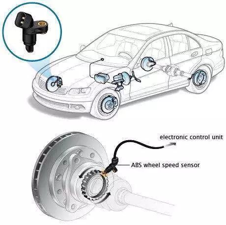 轮速传感器在车轮转动时会产生并传递电信号,转化后可得到车轮转速|repairpal.com