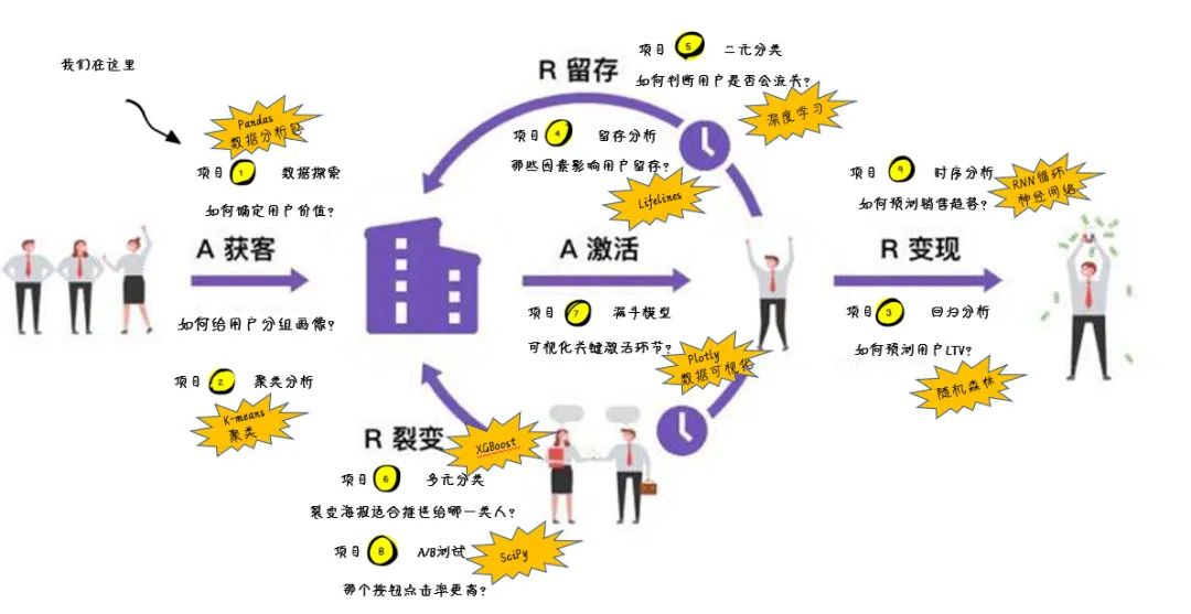 这个部分结合“易速鲜花”这个网络鲜花速递平台的电商场景,设置了获客关、变现关、激活关、留存关、裂变关 5 大关卡。就算没接触过运营场景,也能够完全理解。而且在学机器学习的同时,你还能学到运营的技巧,可谓一举两得。