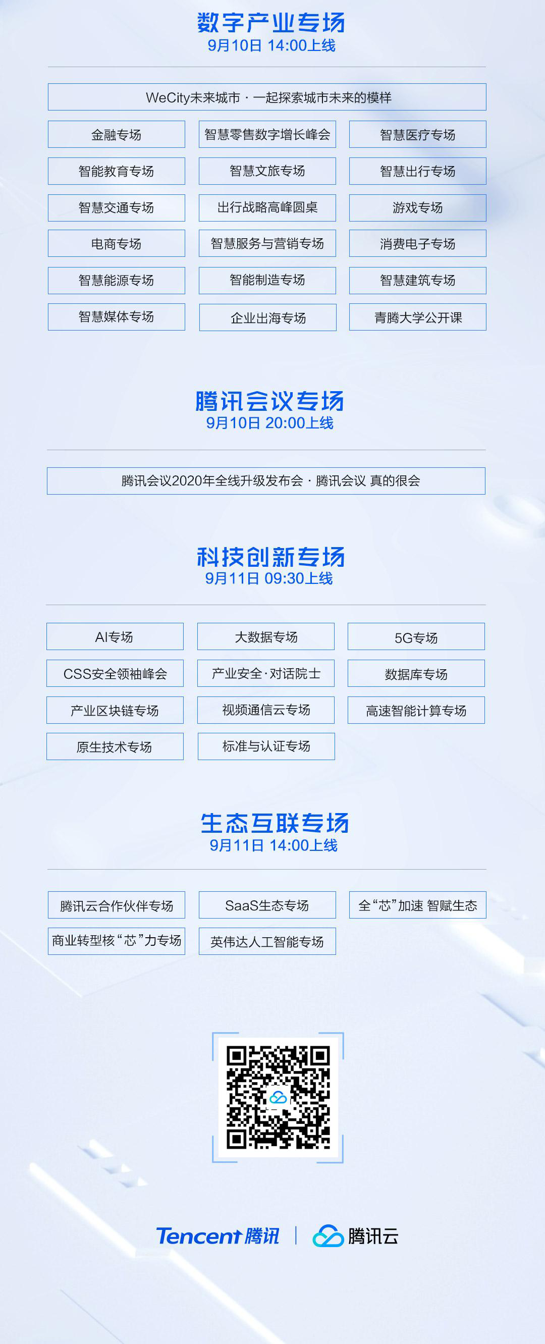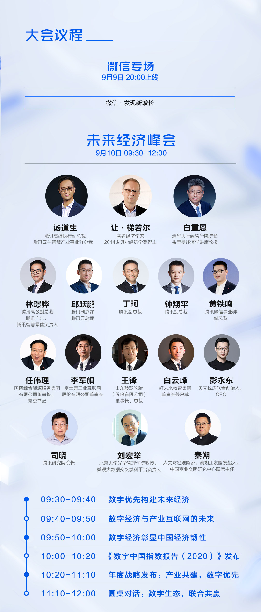 9月10日是大会的高潮部分,以产业互联网落地各行各业为主线,结合产业现状,腾讯产品和解决方案以及落地案例展示技术赋能百业的成果。包含未来经济峰会,青腾大学公开课,腾讯会议升级发布会以及18个垂直行业/领域专场。