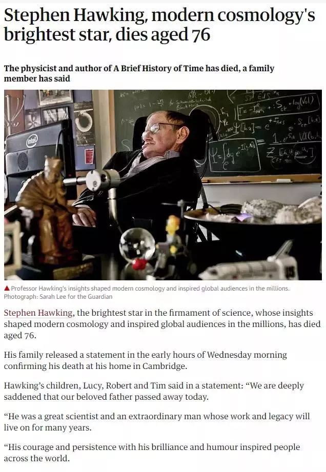 我们深爱的父亲已于今日辞世,我们为此感到极度伤心。他是一名伟大的科学家,一个卓越的人,他的工作成功将会在未来许多年继续存在下去。他的勇气和坚持以及他的天才与幽默鼓舞了来自世界各地的人。他曾经说过: ‘如果不能为你所爱的人提供一个家,宇宙就没有什么意义了。’ 我们将会永远怀念他。