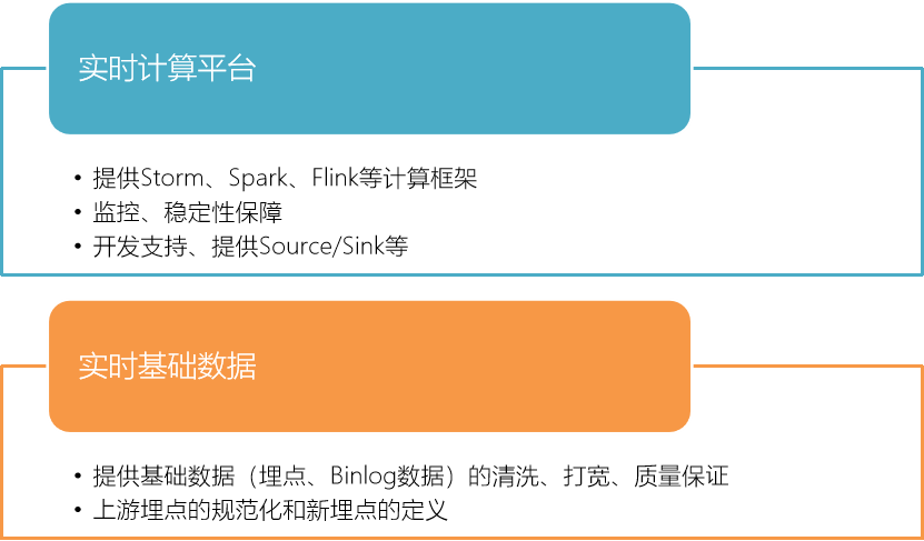 实时基础数据:很多时候我们需要提供基础数据(埋点、Binlog数据)的清洗打宽,这方面技术性也很强,会汇集到各种业务方。此外,格式的定义、自然的监控也是我们来做,会提供技术平台和技术数据,这些体现着平台的重要职责。