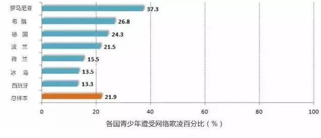 其中罗马尼亚的在校生遭遇网络欺凌的比例最高,西班牙在校生遭遇网络欺凌比例最低 | 参考文献[3]