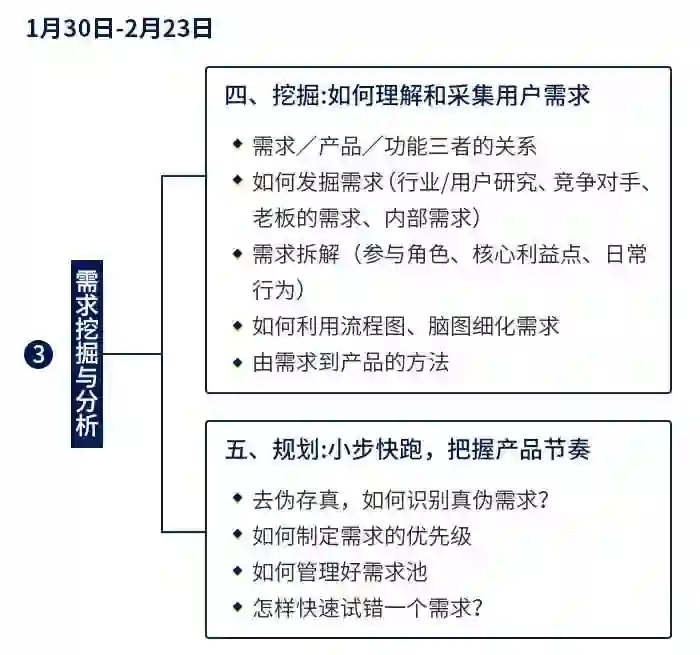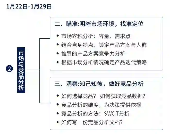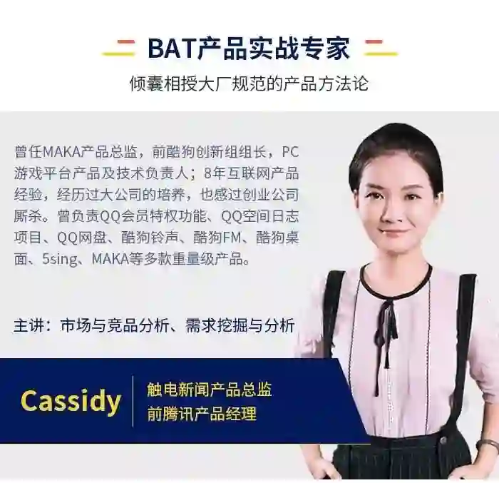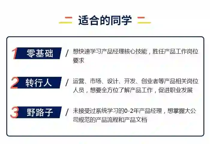 通过3个月的学习,掌握产品经理工作的全流程工作内容和工作方法。从市场分析和竞品分析,到如何进行需求挖掘、分析和管理,再到产品规划及产品设计,还有产品运营推广。帮助缺乏产品经验的同学经历一次产品迭代全流程,更快上手产品工作。