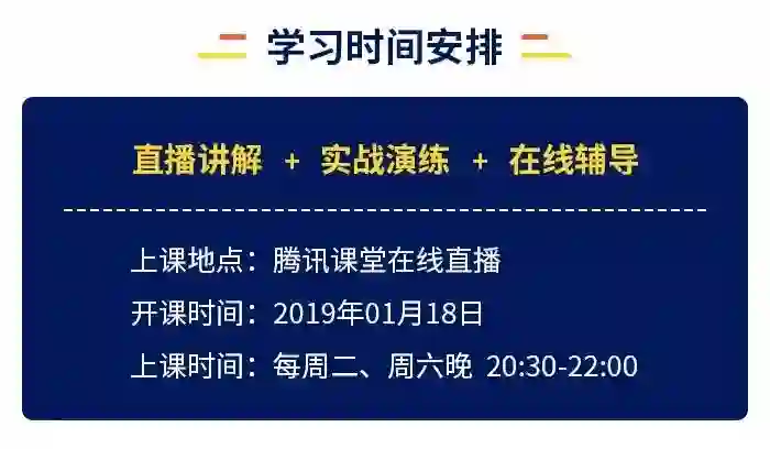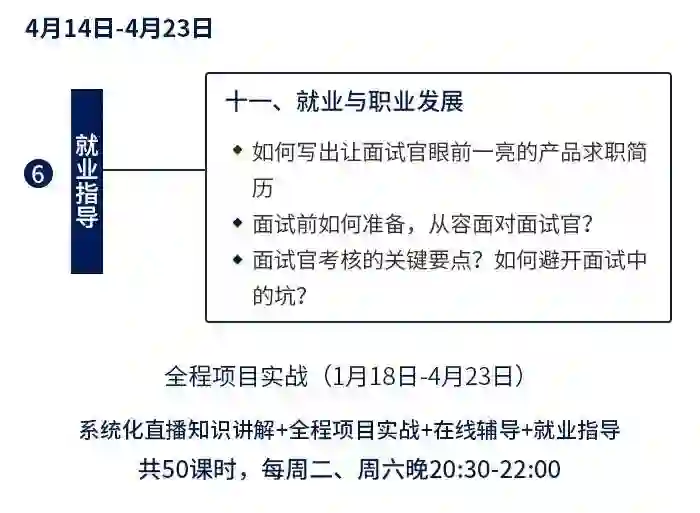 每周2次直播上课:周三、周日晚20:30-22:00,不耽误白天上班。错过直播还可以隔天观看回放。一共50课时,相当于再上了一次大学专业课。