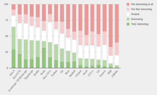 可以看到:作为编程语言界的老大——Java仍然有一票铁粉追随。当然,从来没有人说过学习编程语言是一个非此即彼的问题,也从来没有人是为了学习编程语言而学习。归咎到一点,尽管学习某种新的编程语言,有时是迫于就业形势,是恰逢学习时机,是乐于追求新事物,但我们最终理想的状态是能够掌握所谓“编程的思想”。