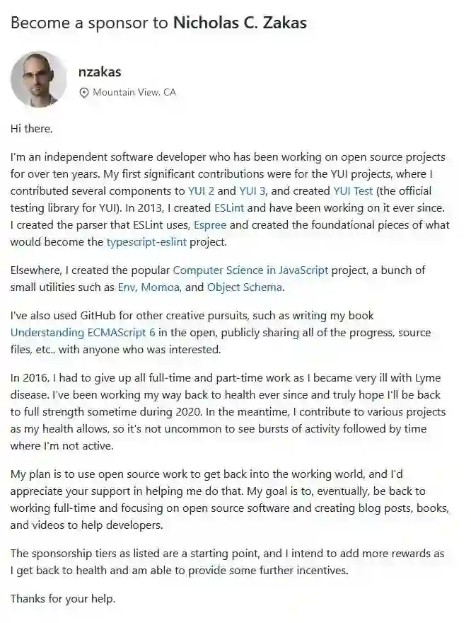 但在现实的压力之下,他不得以在 GitHub 上发起求助(https://github.com/sponsors/nzakas