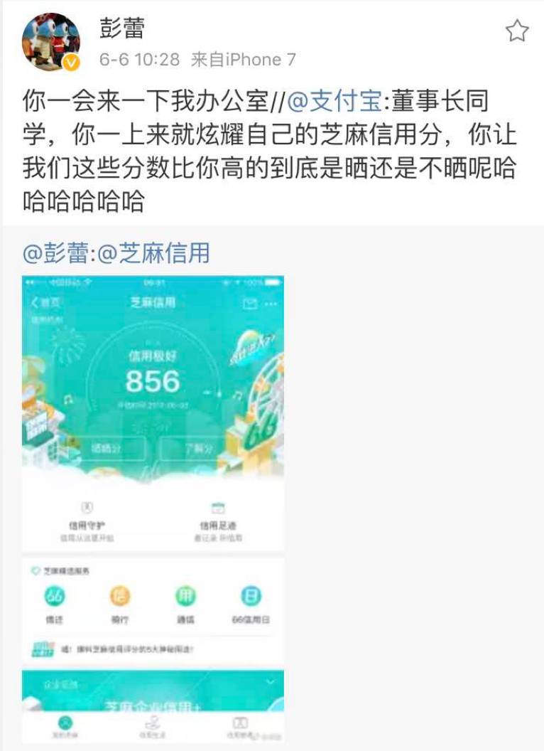 就在这一天,蚂蚁金服董事长彭蕾第一次发微博晒了自己的芝麻信用分:856分。但是,彭蕾的这个分数竟被支付宝微博小编比下去了。支付宝小编调侃彭蕾,“董事长同学,你一上来就炫耀自己的芝麻信用分,你让我们这些分数比你高的到底是晒还是不晒呢哈哈哈哈哈哈”。