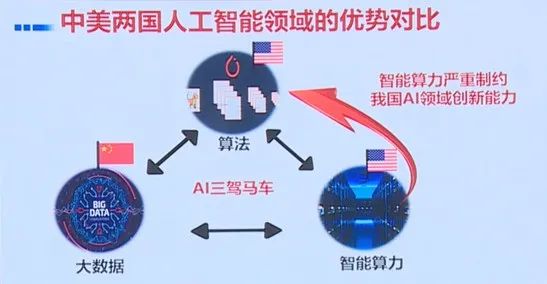 。我们先看大数据,我在大数据上面插了一个中国的国旗,表示我们中国还是有优势的,特别是我们大数据的应用,应该说是不比美国人差,这是大数据。看看智能算力,智能算力严重制约我国AI领域的创新能力,这个人工智能在算力方面,我们跟美国比还差很多,因此在算力方面插了一个美国国旗。再来看算法,算法应该说也是美国人做的比我们好,我们基本上是有点跟踪的味道,他们做出来了,我们过一段时间也把它做出来了,处于这么一个状态。因此三架马车里面,两面是美国的国旗,一面是中国的国旗。