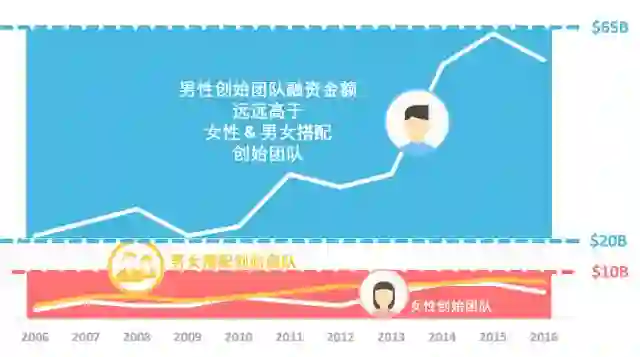 单说2016年,创始人全部为男性的公司融资到的金额是女性的40倍!男性融资数额达到582亿美元,女性只融了14.6亿美元。
