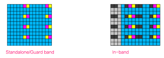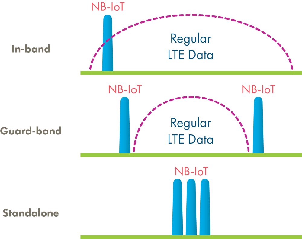 NB-IoT分为三种部署方式:独立部署(Stand alone)、保护带部署(Guard band)和带内部署(In-band)。