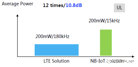 在上行方向,由于NB-IoT最小调度带宽为3.75K或15K,上行功率谱密度最大增强17dB,考虑GSM终端发射功率最大可以到33dBm,NB-IoT发射功率最大23dBm,所以实际NB-IoT终端比GSM终端功率谱密度最高可达7dB左右。