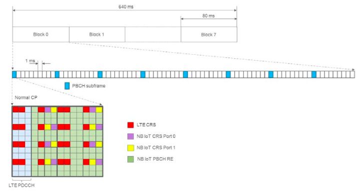 NPBCH信道与LTE的PBCH不同,广播周期640ms,重复8次发送,如下图所示,终端接收若干个子帧信号进行解调。
