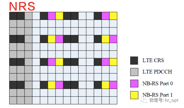 NRS与承载NPBCH、NPDCCH和NPDSCH的子帧中的信息承载符号时频复用,每天线端口每子帧使用8个RE。