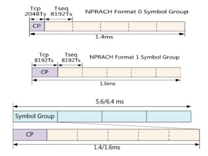 一次的Random Access Preamble传送包含四个Symbol Group,组成1个NPRACH信道,一个Symbol Group包括5个Symbol和1个CP(如下图)。