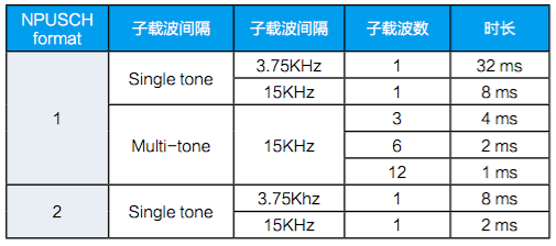 NPUSCH用来传送上行数据以及上行控制信息,上行子载波间隔有3.75KHz和15KHz两种,上行有两种传输方式:单载波传输 (Single tone)和多载波传输(Multi-tone),其中 Single tone的子载波带宽包括3.75KHz和 15KHz两种,Multi-tone子载波间隔15KHz,支持3、6、12个子载波的传输。