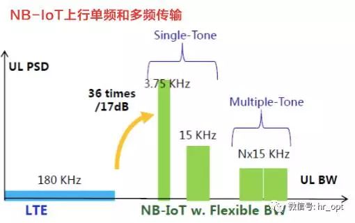 NB-IoT上行支持多频传输(multi-tone)和单频(single- tone)传输。