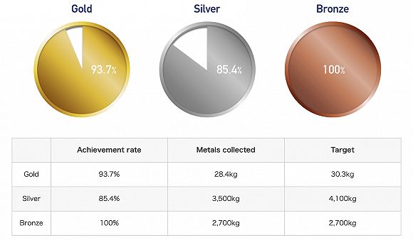 截至目前,日本民众已献出了500多万部旧手机,和近4.8吨的其他废旧电子设备,以参加2020年东京奥运会以及残奥会奖牌制作活动“Tokyo 2020 Medal Project”。2月8日,东京奥组委官员表示,目前收集到的金属量已足够用于明年夏季所需的5000枚奖牌,折合为重量约2吨。有报道称,平均每一部智能手机含0.05克的金,0.26的银以及12.6克的铜。一部笔记本电脑的含金量为手机的10倍。国际奥组委对金牌有明确规定,一枚金牌至少含有6克金,换句话说,500克的金牌中有494克都是其它金属成分。