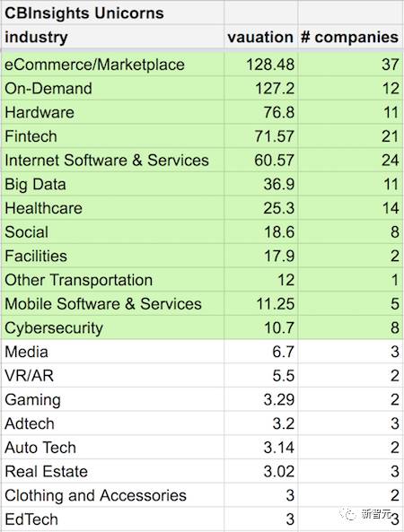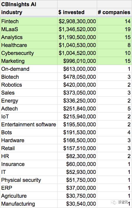 根据 CB Insights 有关独角兽创业公司和 AI 创业公司的数据,在金融(Fintech)和医疗保健领域,独角兽公司和创业公司的数量都有很多。