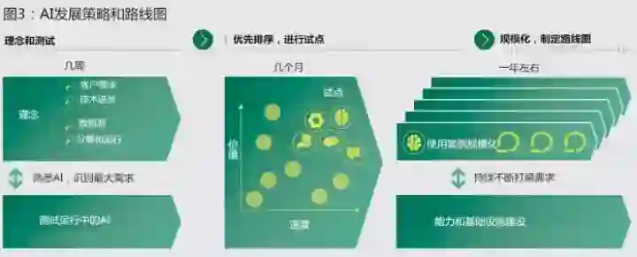 对于AI经验有限的公司,我们强烈建议基于一个很可能实现价值的案例,进行一个并行测试阶段,它的定义应当是合理的,而且复杂程度适中。这个测试将帮助组织了解人工智能,并强调数据或数据集成需求和组织能力和能力,这是下一步的关键投入。