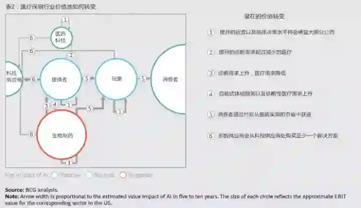 表2展示了一个潜在的场景,说明随着人工智能的采用,整个医疗保健价值池可能会发生怎样的变化。当然,各个行业的玩家的价值增长点变化会有所不同,每个行业都有赢家和输家。最初,大多数公司都会从AI公司的内部运作过程中获益(图2中标记为1的箭头)。受益于研发效率、个性化营销和合理化精简的支持功能,生物制药公司和支付者很可能从这些努力中获益最多。