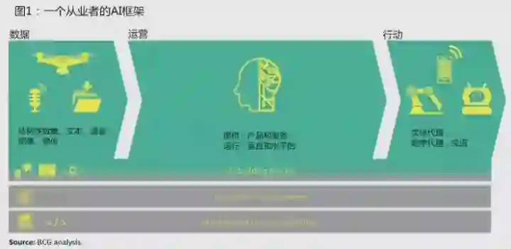 将人工智能应用于工作的概念框架相当直观。(见下表所示)简而言之,人工智能算法吸收数据,处理数据,然后生成动作。然而,这一过程依赖于几个技术层面的适当整合,且确定从数据到行动的具体路径,往往会对企业造成困扰。
