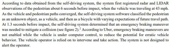 除了这份报告中明显提到的总体系统设计失败外,令人吃惊的是,系统花了好几秒的时间来确定看到的前方到底是什么(无论是行人、自行车、汽车还是其他什么),而不是这种情形下做出唯一的合理决定,从而旨在确保没有撞上。这有几个原因:第一,人们常常会事后会用言语表达其决定。