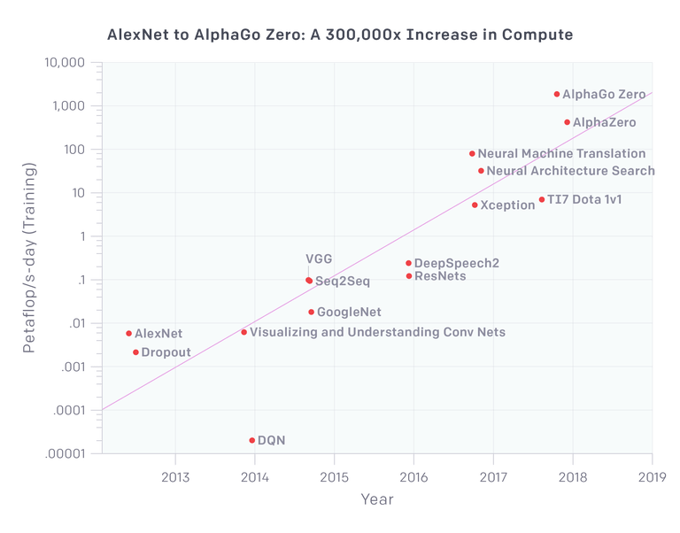 上面图中最近的三个点显示了与强化学习有关的项目,适用于Deepmind和OpenAI玩的游戏。尤其是Alpha Go Zero和更通用一点的Alpha Go获取的计算资源非常多,但它们并不适用于实际应用,原因是模拟和生成这些数据密集型模型所需的数据需要这些计算资源中的大部分。OK,现在我们可以在几分钟内、而不是几天内训练AlexNet,但是我们可以在几天内训练大1000倍的AlexNet,并获得性质上更好的结果吗?显然不能……。