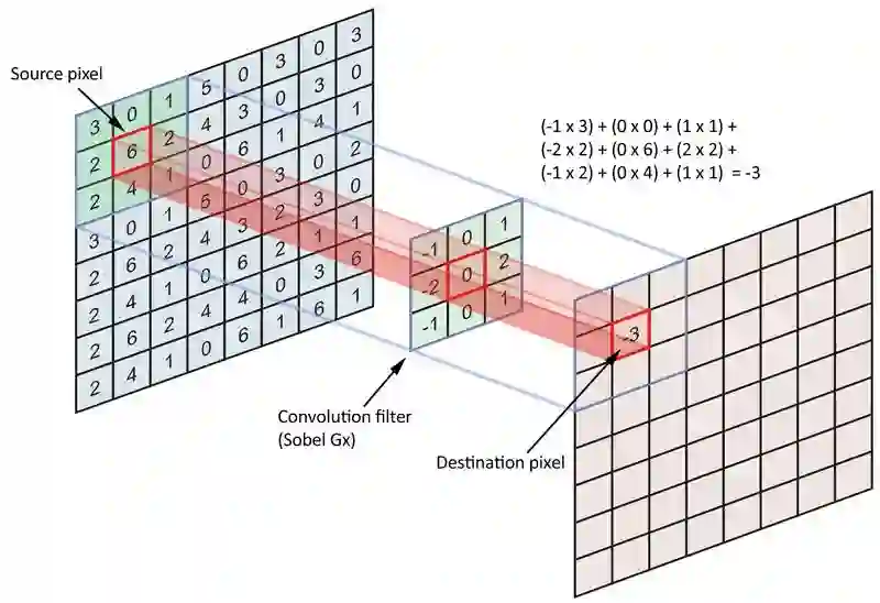 应用于输入矩阵的卷积过滤器(Sobel Gx)示例(来源:https://datascience.stackexchange.com/questions/23183/why-convolutions-always-use-odd-numbers-as-filter-size/23186)