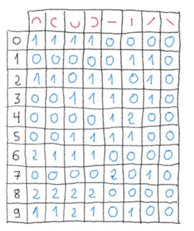 我们首先计算最上面一行的红色形状在每个黑色手写数字中出现了几次。