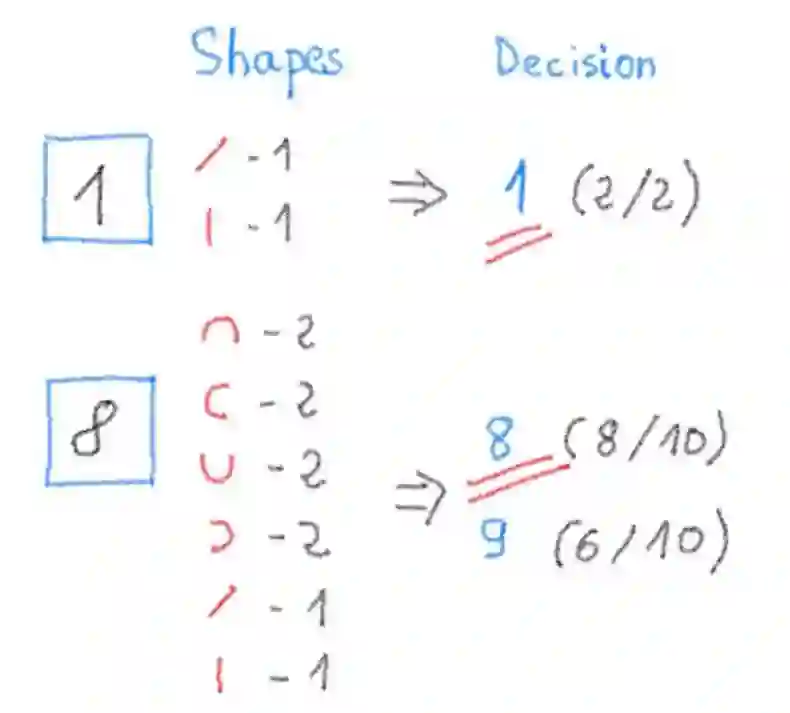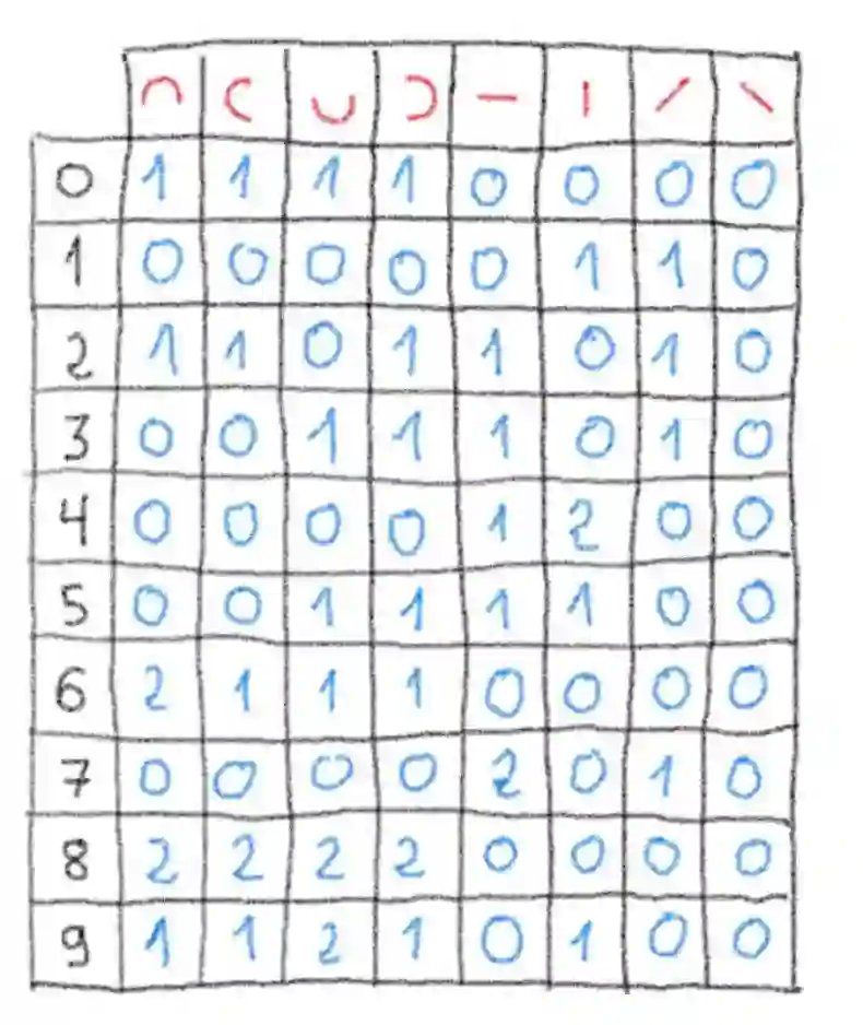 现在让我们尝试通过计算具有相同红色形状的匹配数来识别(推断)新的手写数字。然后我们将其与之前的表格进行比较,以确定这个数字与哪个数字有最强的关联: