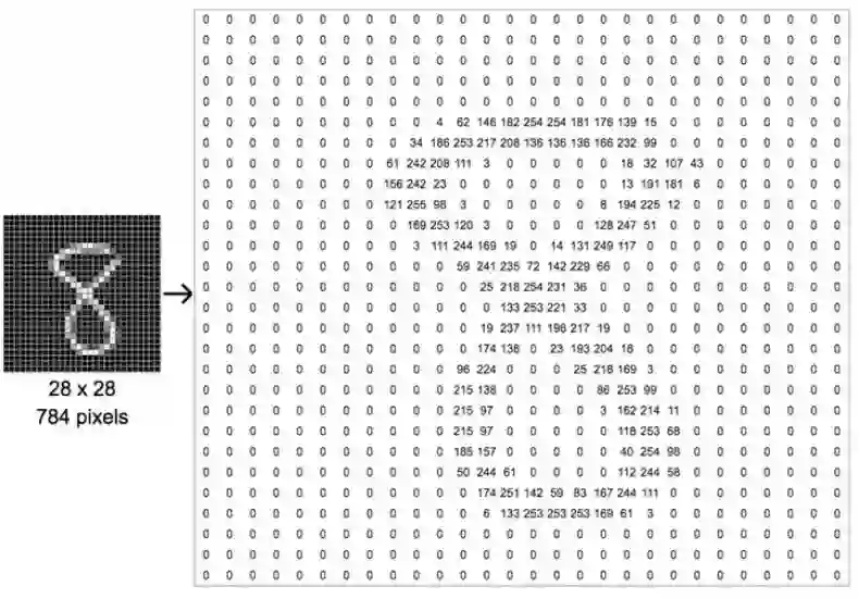 矩阵的每个单元表示从 0(表示黑色)到 255(表示纯白色像素)的像素强度。